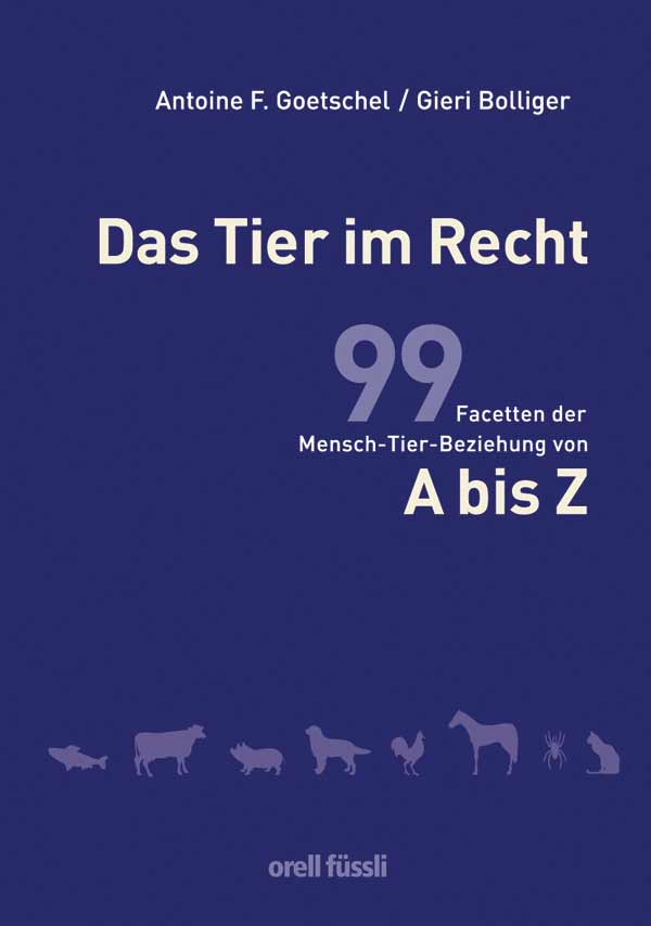 Gleichzeitig erscheint das Buch „Das Tier im Recht – 99 Facetten der Mensch-Tier-Beziehung von A bis Z" der Stiftung für das Tier im Recht. In alphabetischer Stichwortabfolge (von "Affektionswert" bis "Zucht") beleuchten darin Dr.iur. Antoine F. Goetschel und Dr. iur. Gieri Bolliger die Gesetzesänderungen und die brennendsten Fragen des Tierschutzrechts in der Schweiz und im nahen Ausland mit einem sehr ausführlichen Literaturverzeichnis. Jeweils auf einen Blick werden für TierfreundInnen, Gerichte, Behörden und Medienschaffende Inhalt und Tragweite der Mensch-Tier-Beziehung im Recht greifbar. Das 352-seitige Buch ist soeben beim orell füssli-Verlag erschienen und unter ISBN 3-280-0740-6 zu CHF 49.- im Buchhandel erhältlich.