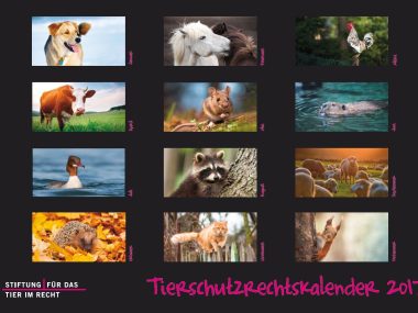 Die Stiftung für das Tier im Recht (TIR) freut sich, den Tierschutzrechtskalender 2017 mit wunderschönen Tieraufnahmen und zahlreichen Antworten zu häufig gestellten Rechtsfragen im Zusammenhang mit Tieren präsentieren zu dürfen. Der Kalender ist ab sofort im TIR-Shop erhältlich.