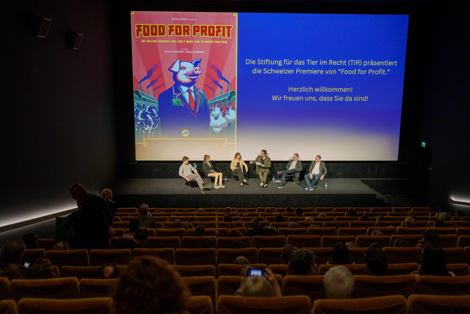 Im Anschluss an die Filmvorführung diskutierten Expertinnen und Experten aus der Fleisch- und Eierbranche und Tierschutz die Parallelen und Unterschiede von "Food for Profit" mit den Zuständen in der Schweiz. Teilnehmende der engagierten Podiumsdiskussion waren Meinrad Pfister (Landwirt und Unternehmer bei Pfiroporcs GmbH), Daniel Würgler (Präsident Gallo Suisse), Meret Schneider (Projektleiterin Kampagnenforum), Tobias Sennhauser (Tier im Fokus TIF) und TIR-Juristin Dr. Vanessa Gerritsen. Moderiert wurde der Anlass von Salar Bahrampoori vom Schweizer Fernsehen SRF.