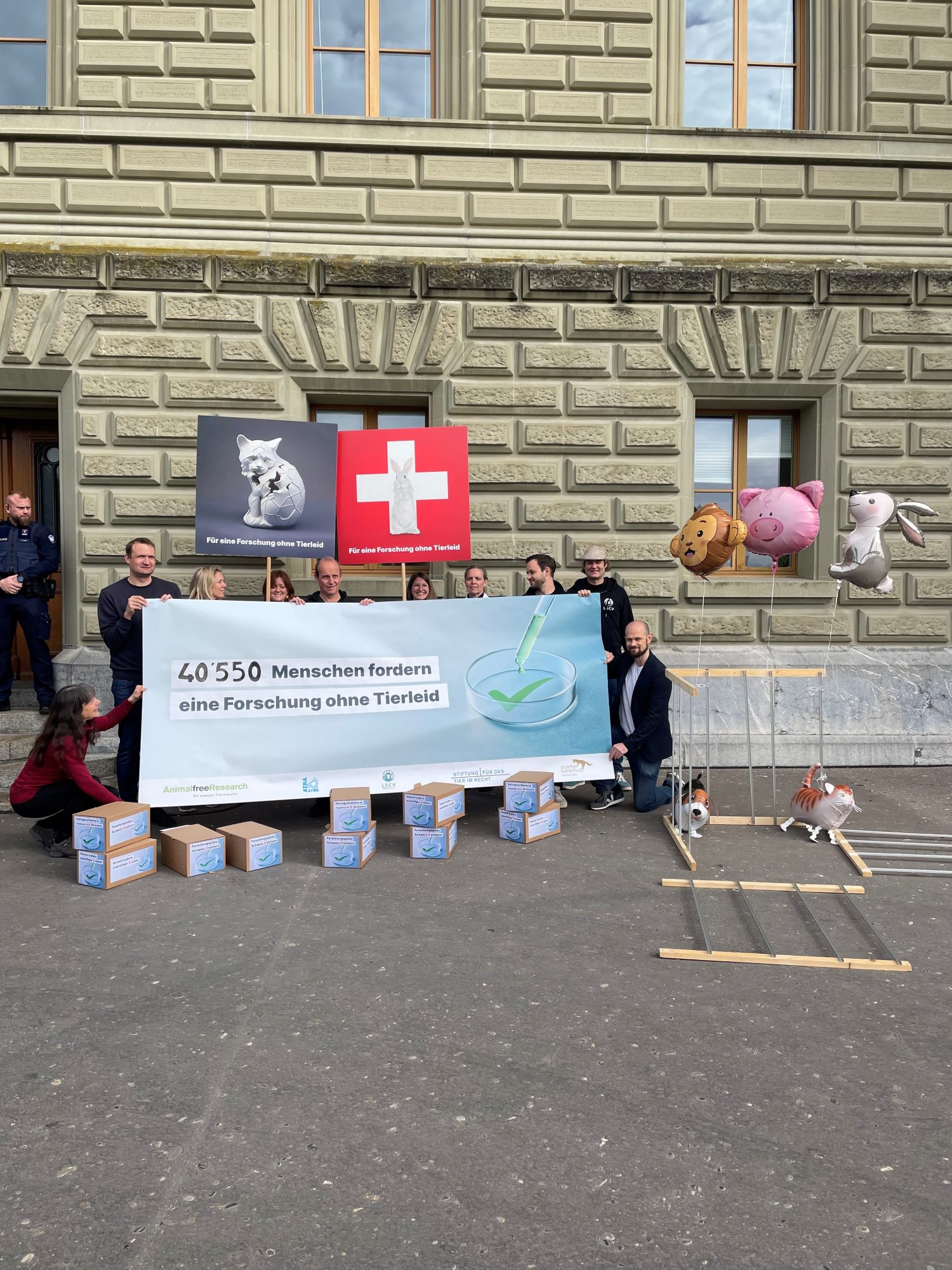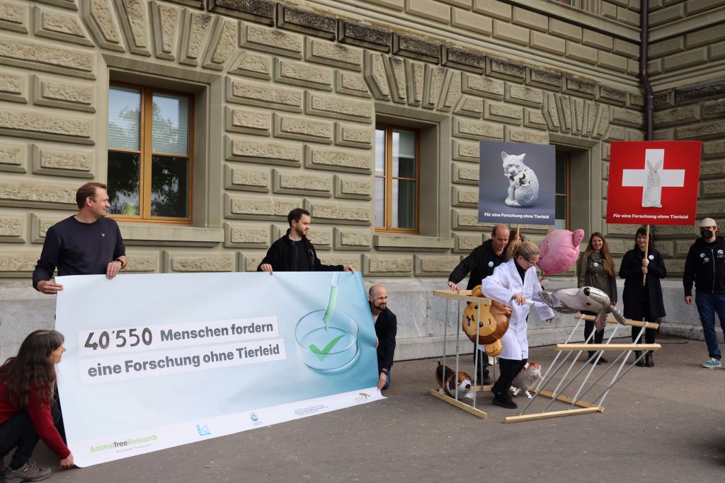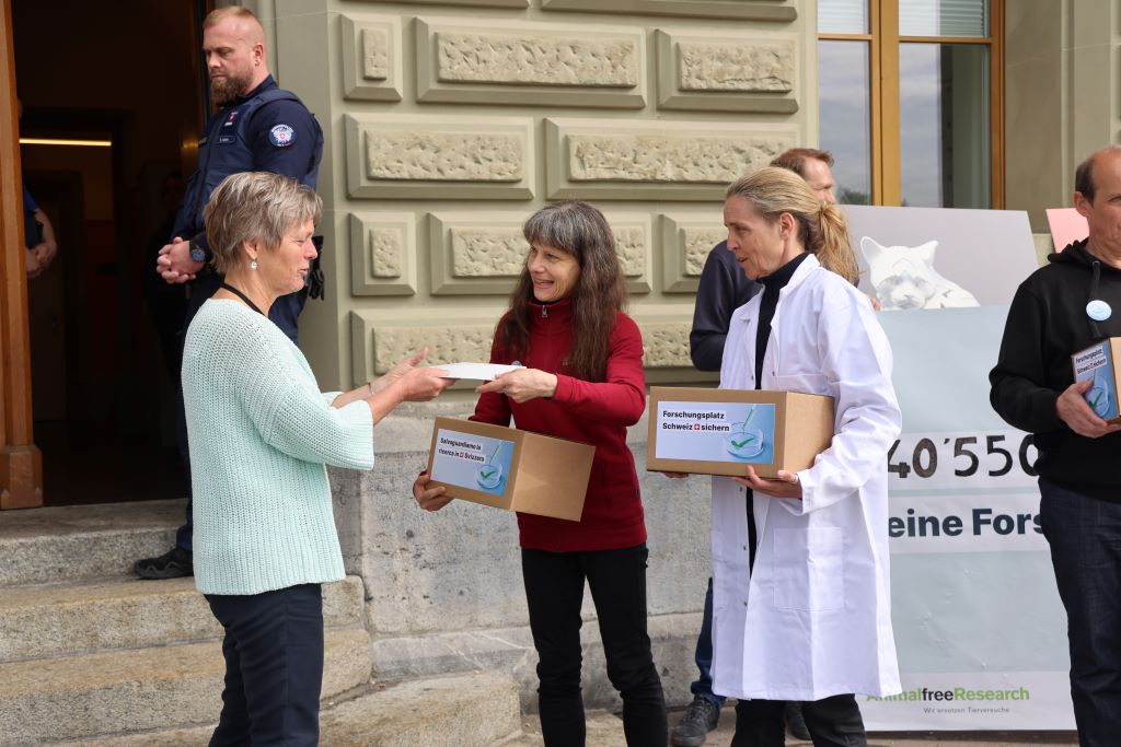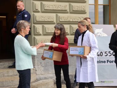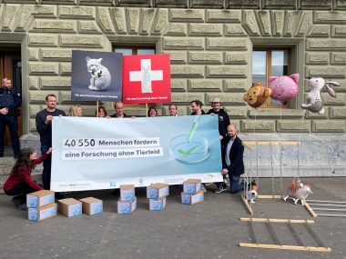 Gemeinsam mit Animalfree Research (AfR), dem Zürcher Tierschutz, der Schweizer Liga gegen Tierversuche und für die Rechte des Tieres (LSCV) und der Associazione svizzera per l’abolizione della vivisezione (ATRA) hat die Stiftung für das Tier im Recht (TIR) im vergangenen Jahr die Kampagne "Forschungsplatz Schweiz sichern" lanciert. Die fünf Organisationen wollen damit ein Zeichen setzen für eine innovative, effiziente Wissenschaft ohne Tierleid. Bestandteil der Kampagne ist eine entsprechende Petition, die am heutigen Vormittag mit über 40'000 Unterschriften in Bern übergeben wurde.