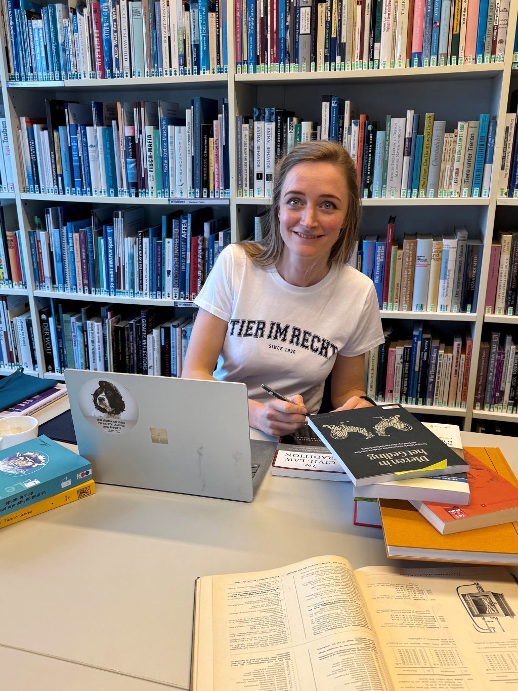 Abgesehen von der Forschung fühlte ich mich im TIR-Büro sehr willkommen, umgeben von all den erstaunlichen menschlichen und nicht-menschlichen Kollegen. Eine Woche war viel zu kurz, und ich hoffe, dass ich bald wiederkommen kann. Wenn Sie im Tierrecht arbeiten, kann ich Ihnen nicht genug empfehlen, in dieser einzigartigen Bibliothek vorbeizuschauen, einem Paradies für Tierrechtler mitten in der Schweiz. Ein herzliches Dankeschön an das TIR-Team für seinen Empfang, seine Unterstützung und seine Gastfreundschaft."