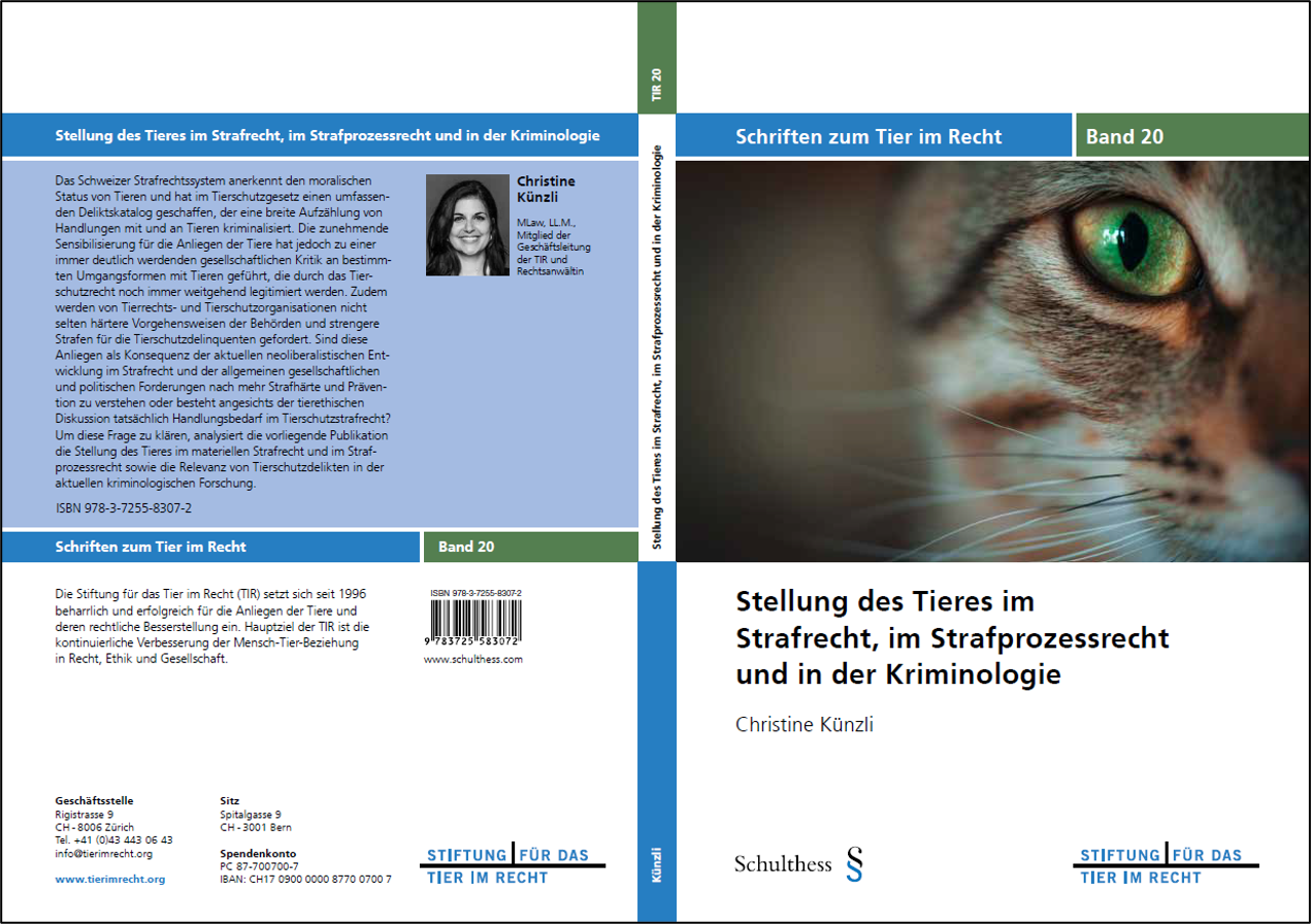 Die Stiftung für das Tier im Recht (TIR) unterhält seit 2003 eine Datenbank mit sämtlichen dem Bundesamt für Lebensmittelsicherheit und Veterinärwesen (BLV) seit 1981 gemeldeten Schweizer Tierschutzstrafentscheiden. Jedes Jahr analysiert die TIR das Fallmaterial des Vorjahres eingehend und präsentiert die Resultate in einem ausführlichen Bericht über die Entwicklungen und Tendenzen der Schweizer Tierschutzstrafpraxis.