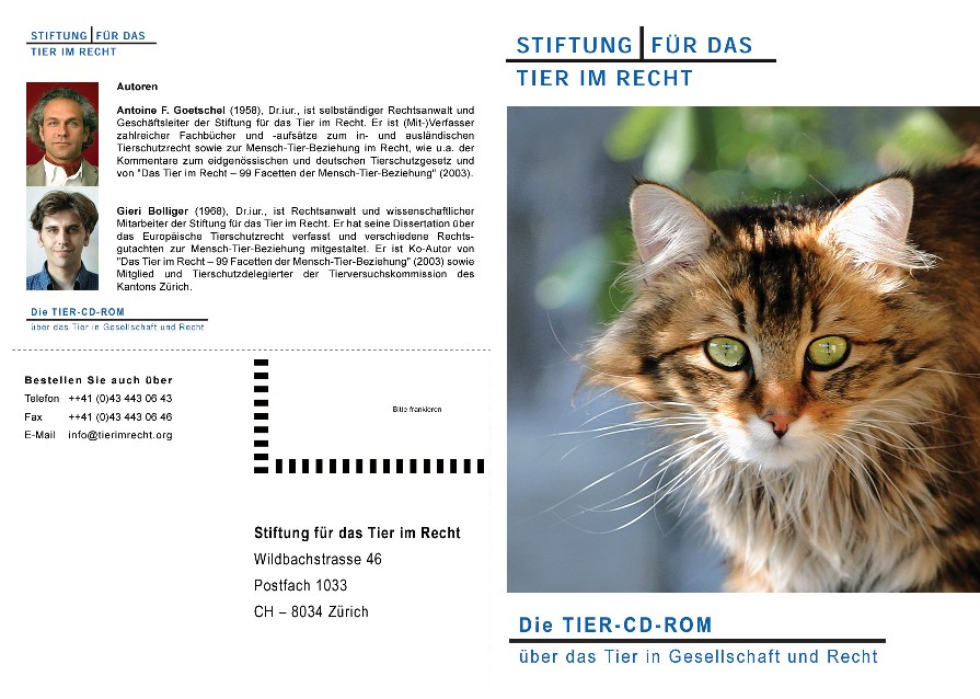 15.05.2004Wie schon letztes Jahr hat die Stiftung für das Tier im Recht auf den Welttiertag vom 4. Oktober 2004 hin ein pionierhaftes Produkt vorgestellt. Die TIER-CD-ROM wurde für Tierhaltende, Medienschaffende, Vollzugsverantwortliche, Behörden und Gerichte, TierärztInnen, AnwältInnen, Studierende, Schulen und Tier-Organisationen und somit auch für das Tier erarbeitet.